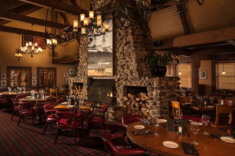 James Tavern was a sprawling restaurant with lots of dark wood and stonework. It was divided into several rooms, many of which had roaring fireplaces and enormous insets to the side with intricately stacked wood piles. There was a general dining room, a smaller intimate library, a more open bar area, and several other dining sections, each with its own wait stations placed off to the side with glasses, ice, and coffee makers spread throughout the restaurant for quick access.