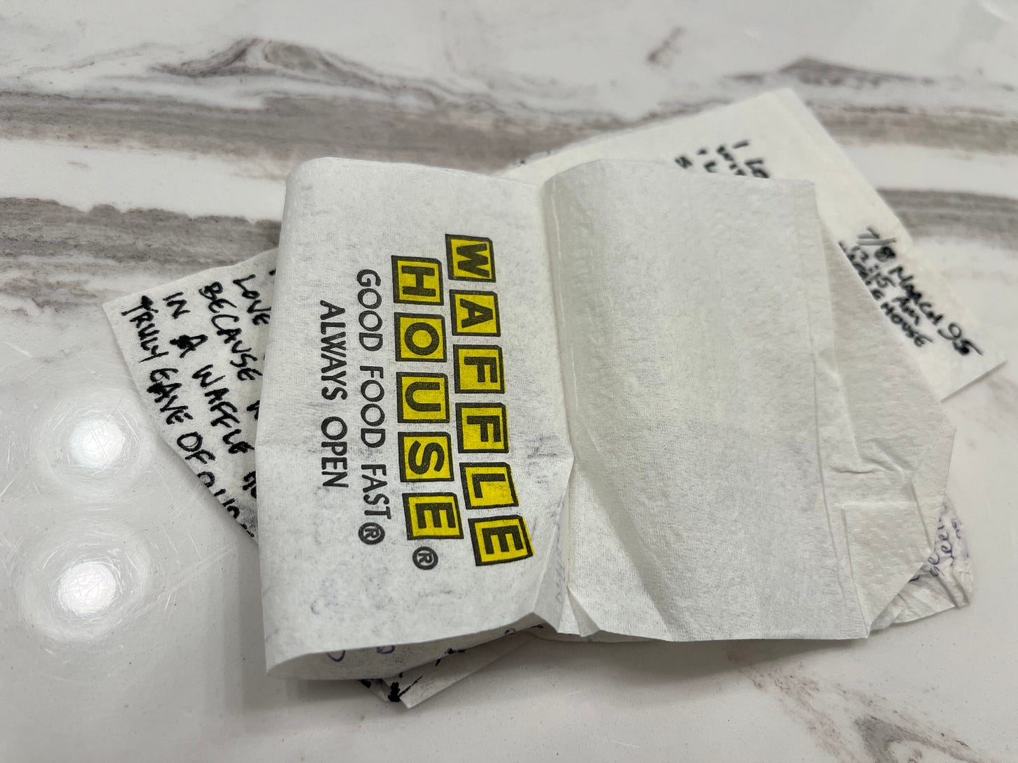 In the weeks after the show closed we’d meet halfway between our homes at a Waffle House later in the evenings after she got off work. Despite the late hours, we’d order coffee and I’d stuff napkins in my pockets that I’d later use to write love letters to her.